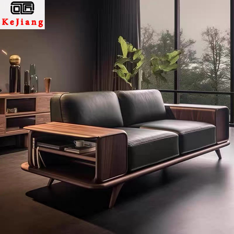 新しい中国風のウォールナットレザーソファリビングルームアンティークスタイルヴィラ大小サイズ無垢材3人掛けストレートソファ