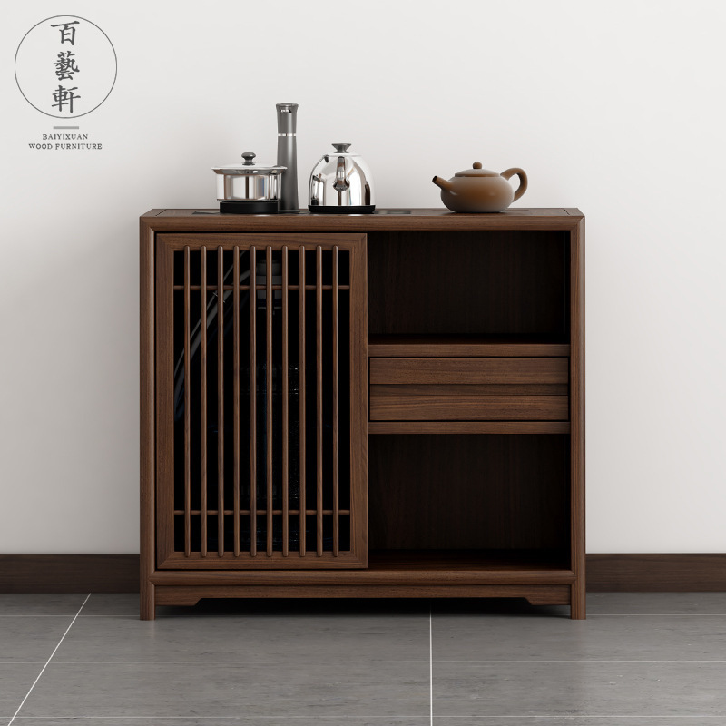 新しい中国風のティーキャビネット無垢材ブラックウォールナット古いニレ茶テーブル茶テーブル下バケツ茶サイドキャビネット湯沸かしキャビネット