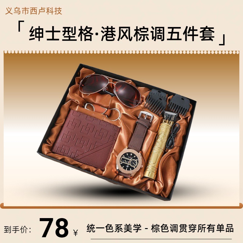 高級感香港風茶色男性5点セットファッション時計腕修胡刀眼鏡キーホルダー財布