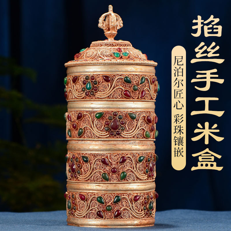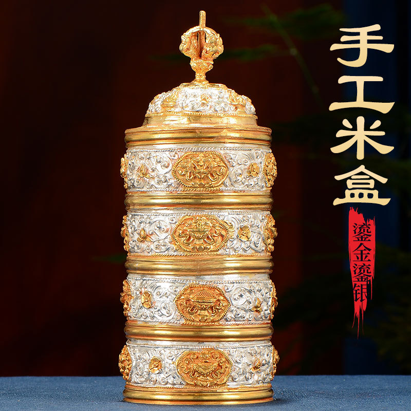 仏縁匯の手作りの米の箱のネパールの銅のの金のの銀の彫刻の4層の宝の瓶のチベット式の家庭の客間の置物