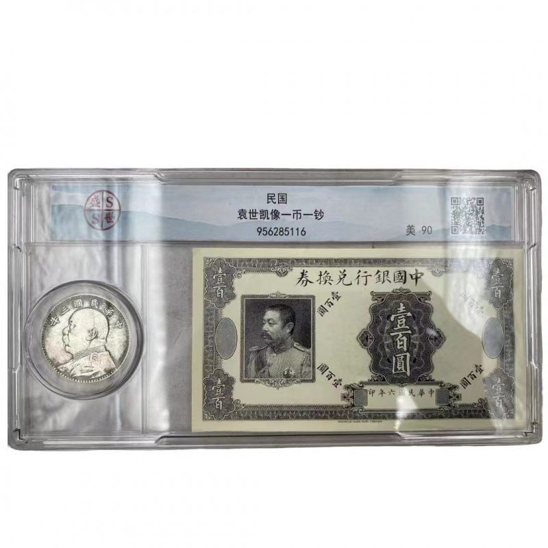 アンティーク中華民国袁大頭銀貨、1コイン2紙幣、アンティークセット、100元、50元、25元