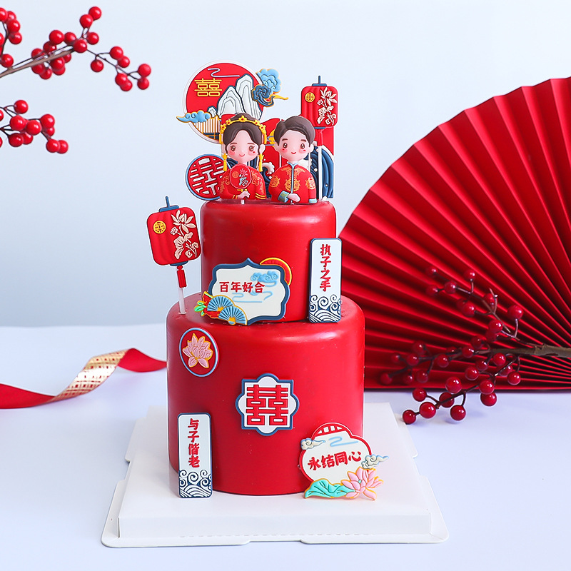中国式の結婚式のレトロな柔らかいゴムのケーキの装飾の古風な新婦の新郎のプラグインの百年の良い一致の永結の同心の対聯