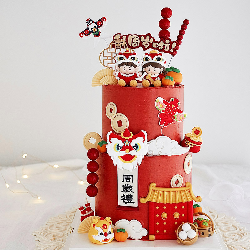 新年のお祝いのライオンの人形の置物中国式のライオンの男の子の錦鯉の女の子のケーキの装飾の人形