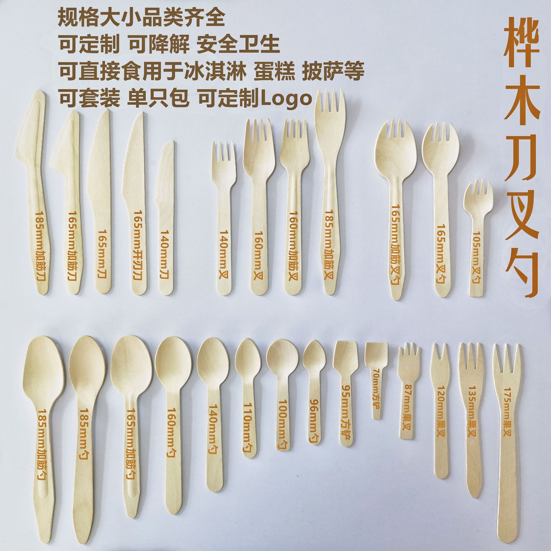 生分解性使い捨て白樺製食器、木製ナイフ、木製フォーク、木製スプーン、フルーツフォーク、アイスクリームスプーン、ロゴをホットスタンプ印刷可能