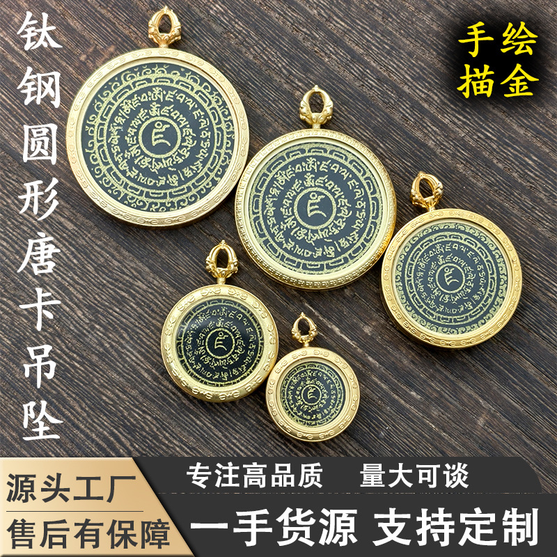チベット式熱貢手描き描金黄財心呪円形サイズチタン鋼唐カード男女共通モデルペンダント