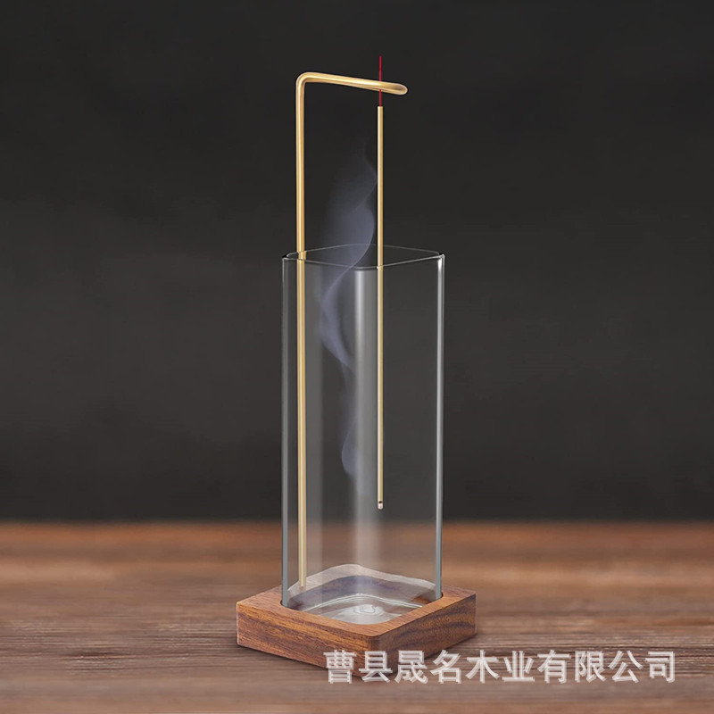 ガラス吊り香炉、金属製香立て、防風・飛散防止ガラス、ブラックウォールナット、サペリ無垢材、逆さ香立て