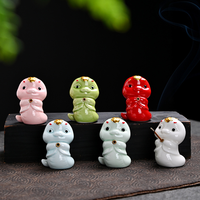 創意かわいい萌え巧描金小蛇陶磁器香挿香炉生肖線香造景デスクトップ置物茶盤茶寵
