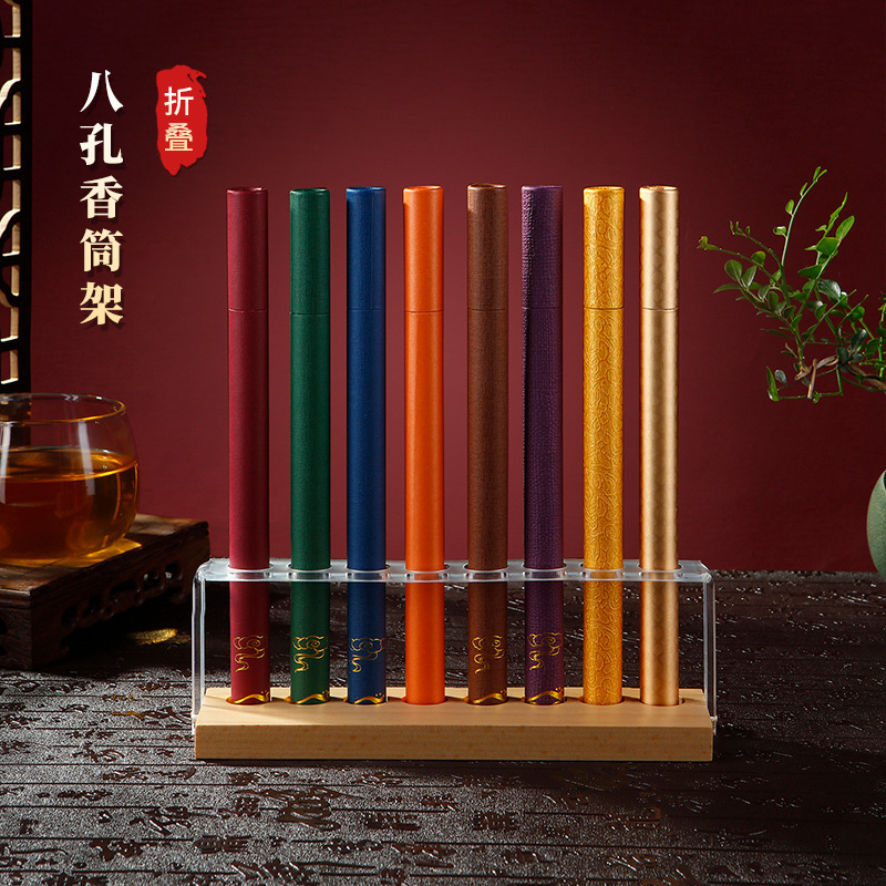無垢材8穴香筒ディスプレイラック、ブナ材アクリル香管ホルダー、沈香白檀線香筒収納ディスプレイラック