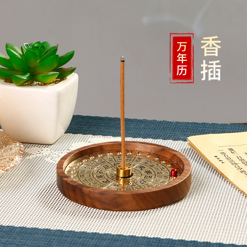 万年暦香挿し香座真鍮四穴線香挿し黒くるみ木香盤家庭用室内卓上カレンダー置物