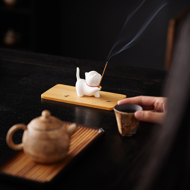 故宮の猫の香りはお茶のテーブルの香りの工芸品の陶磁器のかわいい小さい猫の香炉の香りを挿して香りの茶道の置物を聞きます。
