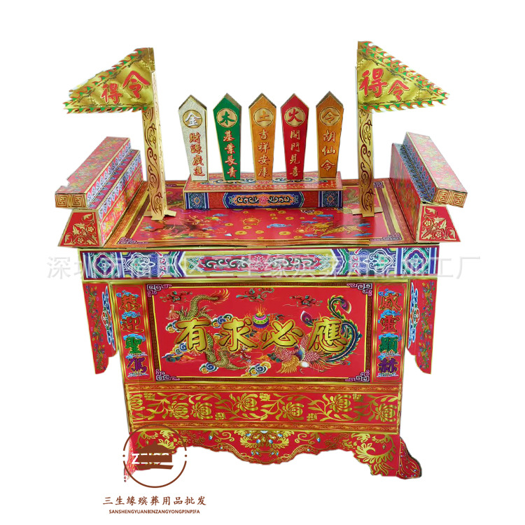 段ボール紙供物台、八角樽、六角樽、金塊、金レンガ、紙束、五七活、祭壇、三生源