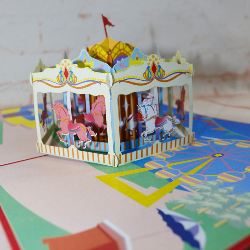 新型回転トロイの木馬カラー印刷七彩音楽照明3d立体グリーティングカード遊園地玩具モデル設計