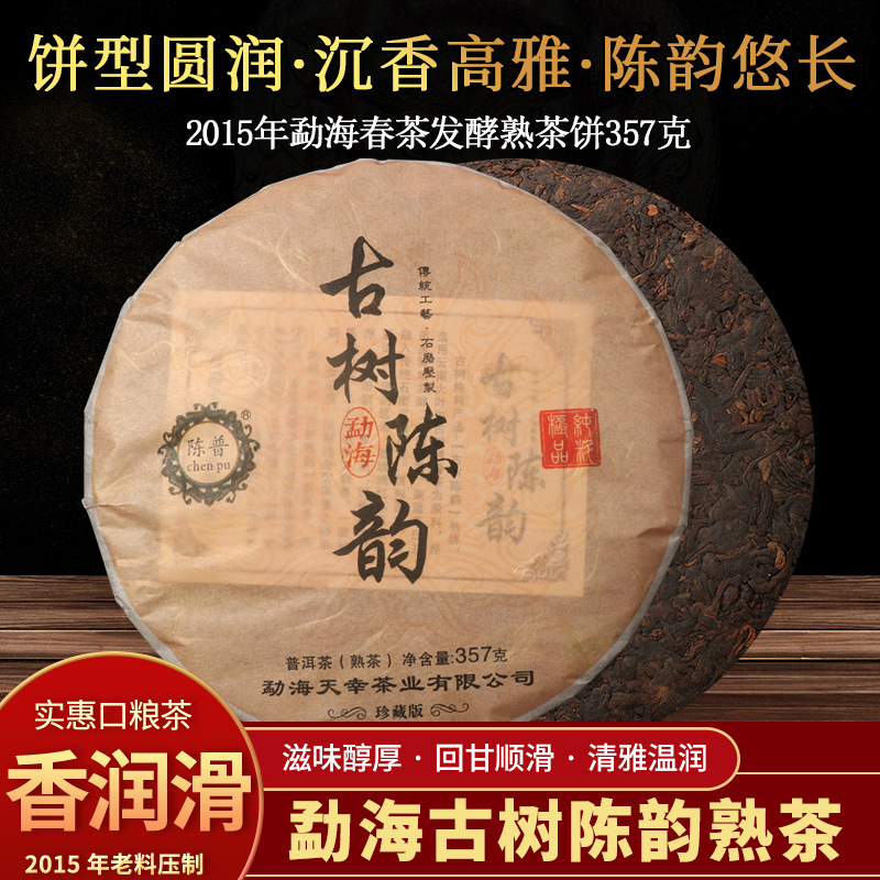 プーアル茶葉15年モウ海陳年一口料古樹陳韻357g雲南七子餅熟普