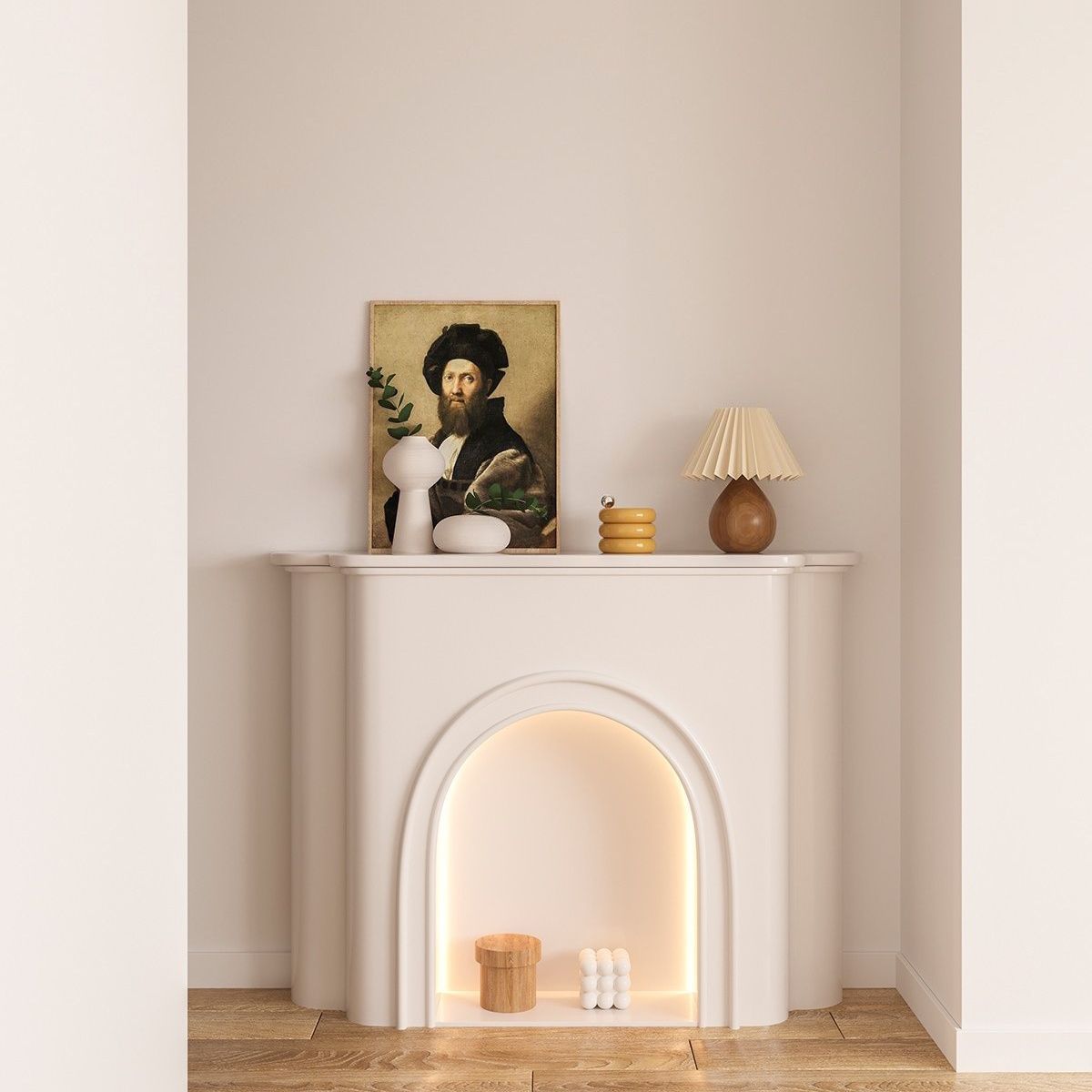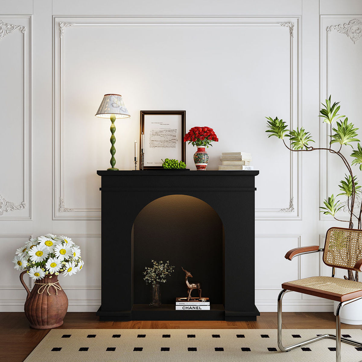 フランス式暖炉クリーム飾り戸棚北欧玄関シンプルな白い民宿撮影入戸ネット赤客間