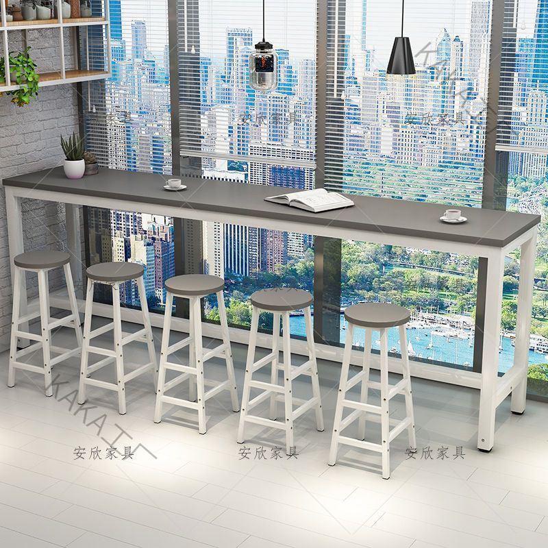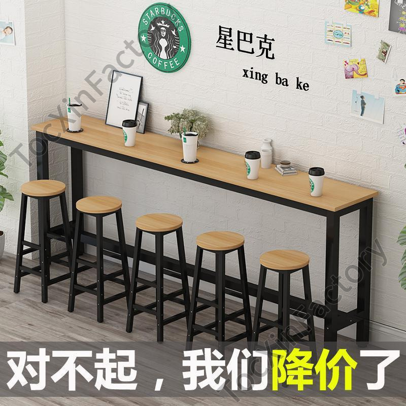 北欧のシンプルなバーテーブルのミルクティー店のテーブルと椅子の組み合わせバーテーブルの高足テーブルは壁のバーテーブルの長いテーブルに寄りかかっています。