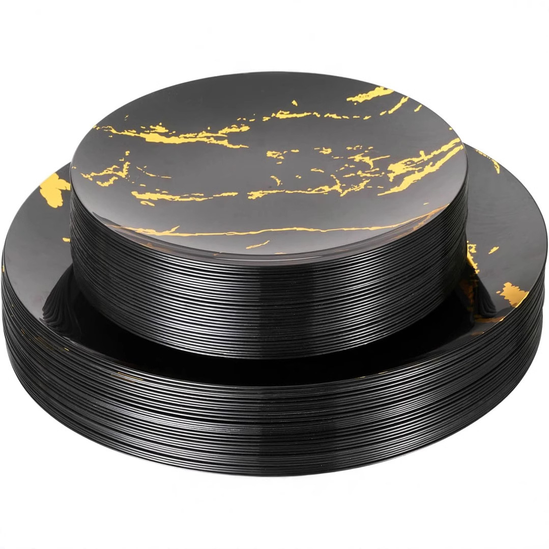 硬質プラスチック使い捨てディナープレート黒大理石プレート黒背景ゴールデン西洋ディナープレートホワイトゴールドエッジディナー
