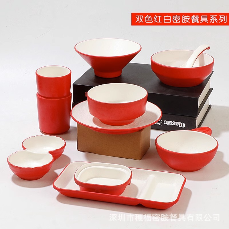 メラミン紅白の2色の調味料皿は磁器の鍋の味噌の材料の碗の小さい碗の杯のスプーンの業務用の置物のセットの食器をまねます。
