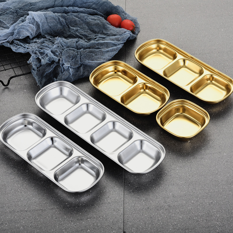 304ステンレスの韓国式の2格の3格の味の皿の金色の調味料の皿の鍋の調味料の皿の調味料の皿の焼肉の食器