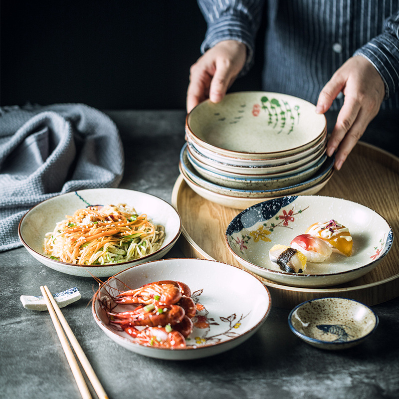日本式釉薬下彩料理皿寿司料理皿陶磁器皿家庭用円形果物平皿問屋用