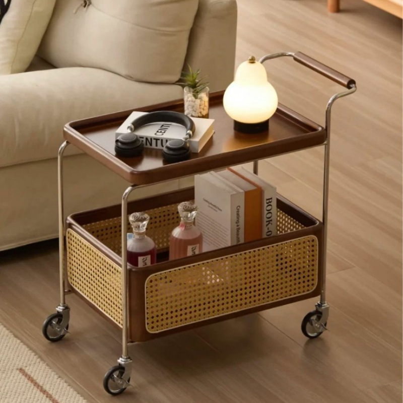 寂風レトロ収納カート北欧実木辺のリビングソファ藤編み物棚移動可能サイドキャビネット
