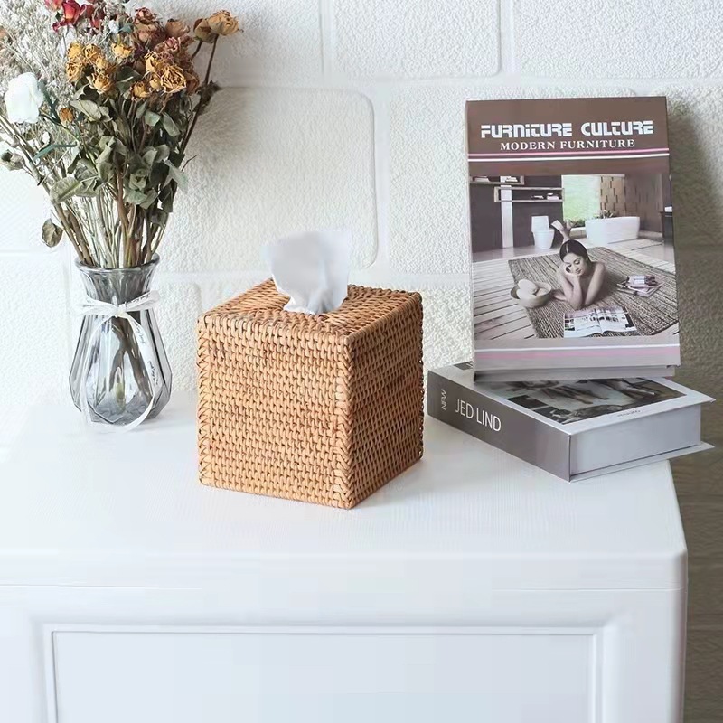 フレンチ北欧籐織り北欧レトロクリエイティブデスクトップリビングルームダイニングルーム木製正方形ティッシュボックス収納