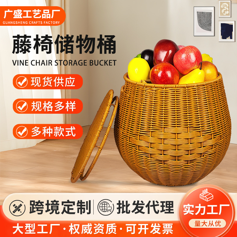 リビングルームホームレジャー収納バスケットスツール収納スツール大型ラウンド手作り中国風模造籐椅子収納バケツ