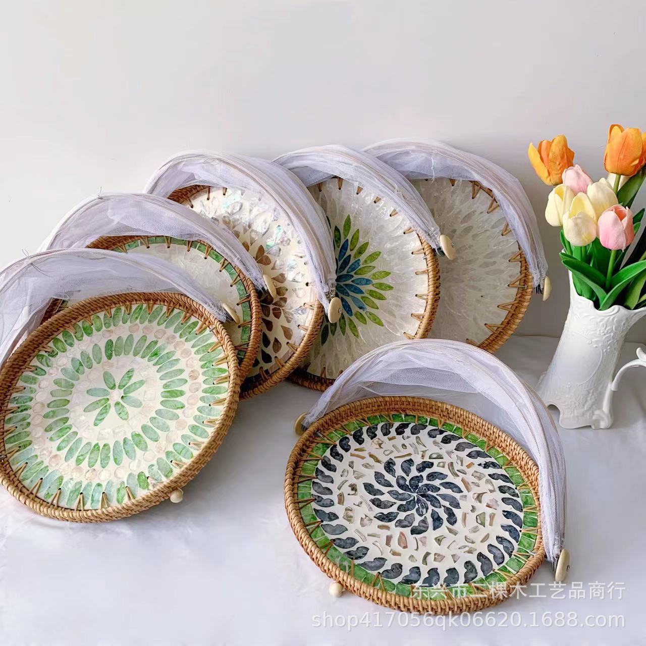藤編みの個性的な創意手は多彩な貝殻の網を象眼して蚊の果物のかごの野菜のカバーの家庭用実用的な果物のかごを防ぎます。