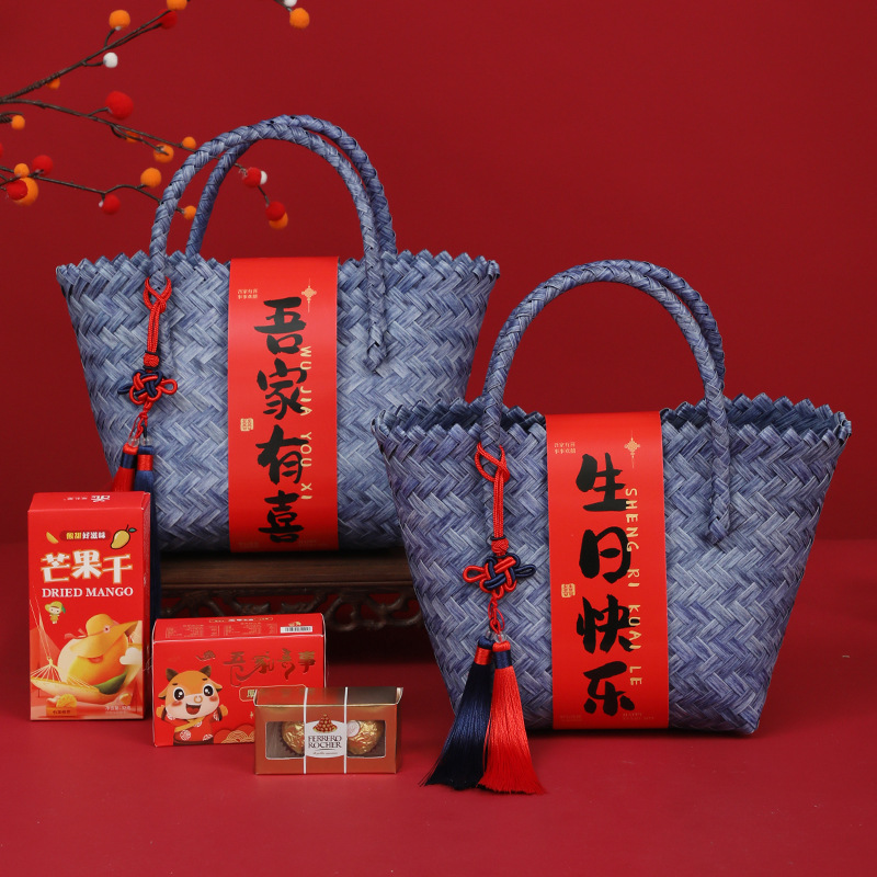 純赤色の中国風結婚式の贈り物包装、記念品バッグ、新築祝い、満月祝い、編み込みハンドバッグ、結婚祝いのバスケット、籐製