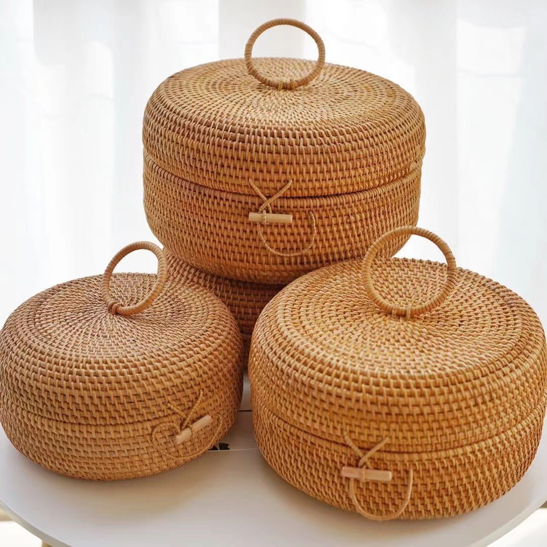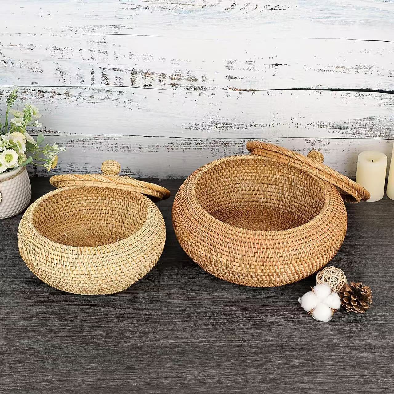 手作り藤編み収納ケースデスクトップ小雑物整理ケース円形形蓋付き茶葉包装ケース小キャップ