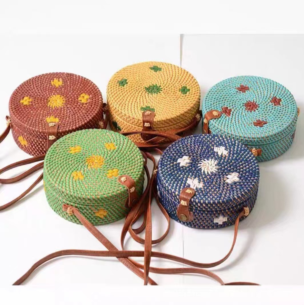 手作り藤編みバッグ円形ハンドバッグレトロ草編みバッグ森系ビーチバッグ女性バッグドーパミン女性バッグ