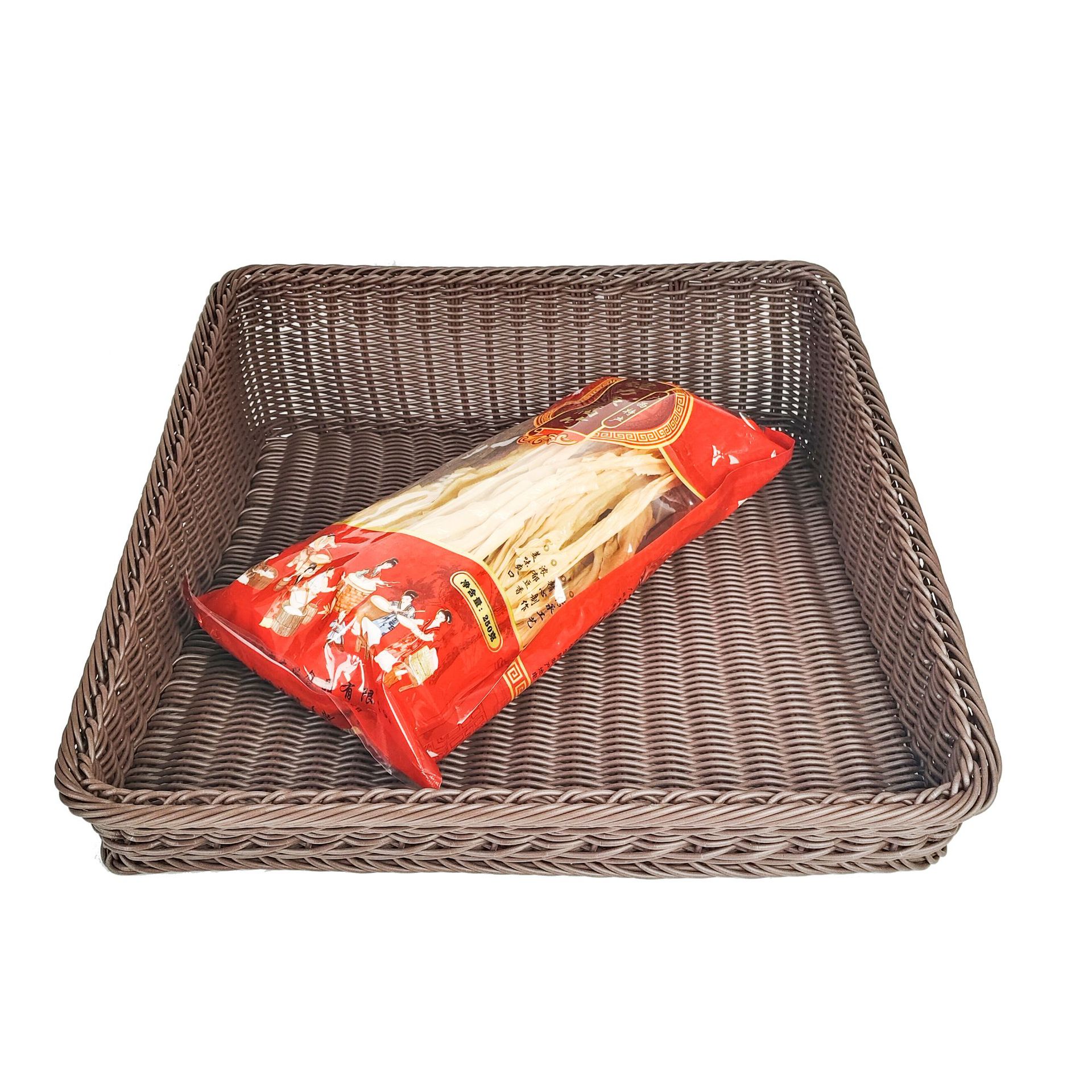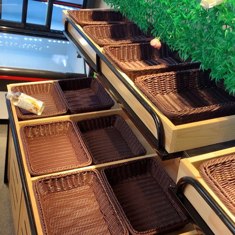 スーパーマーケットの果物の皿のパンのかごの展示かごは藤編みの果物の皿の果物のかごの長方形のお菓子の皿の果物のたらいをまねてかごを収納します。