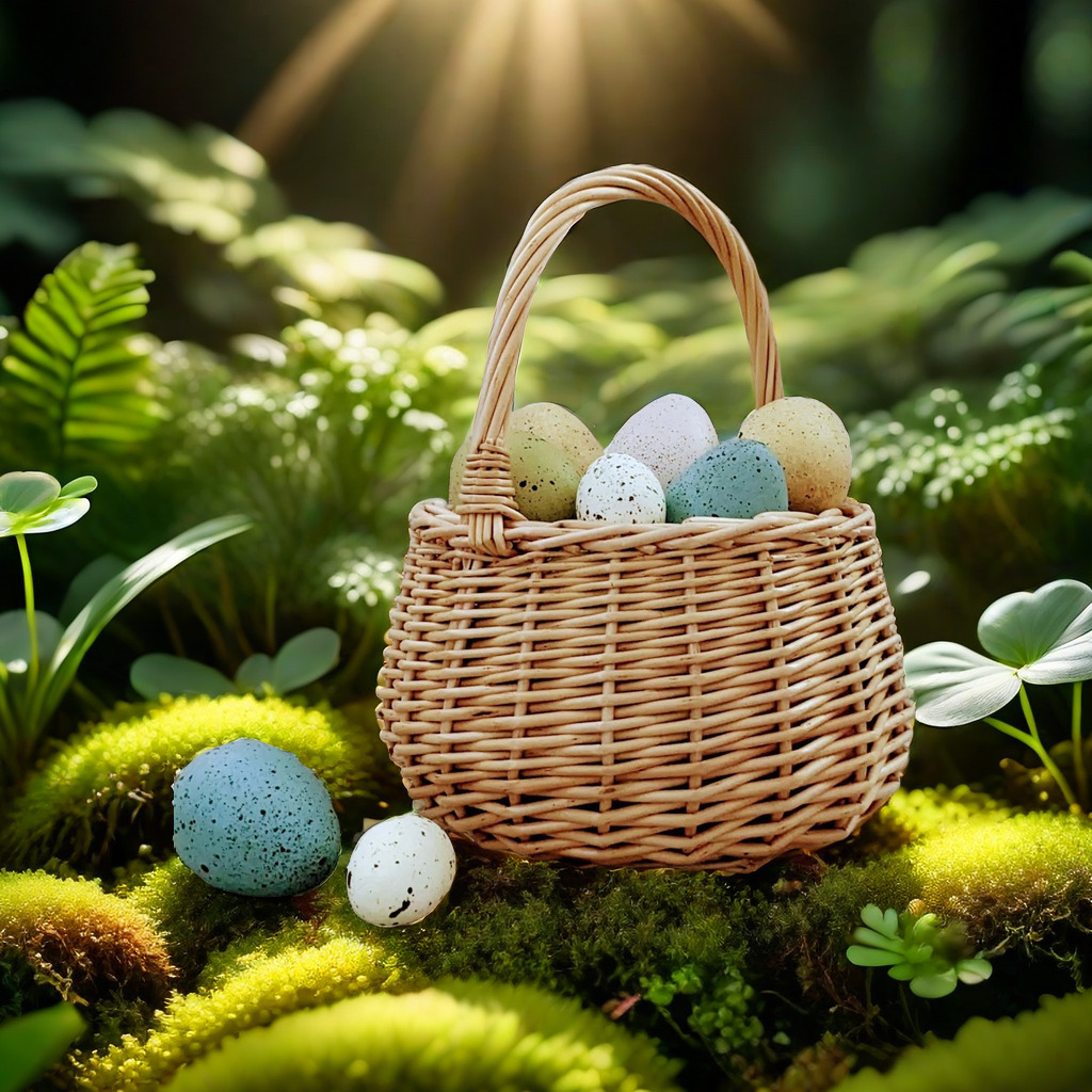 洗練された迷爾かご春のアイデア生け花の小さな藤かごと多彩なイースターエッグかごの組み合わせ
