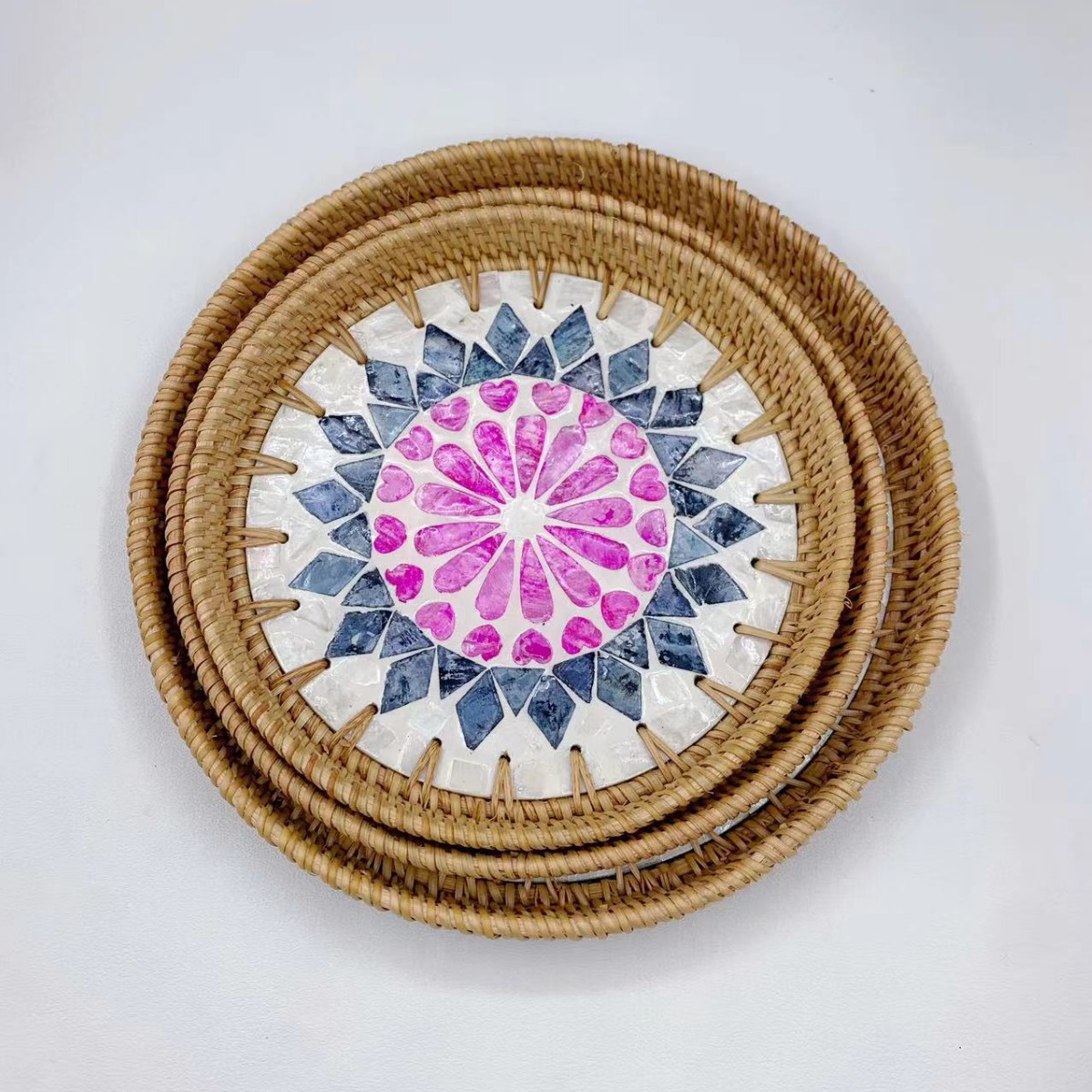 秋藤編み円形曼荼羅花貝殻象眼間食果物多用途トレー