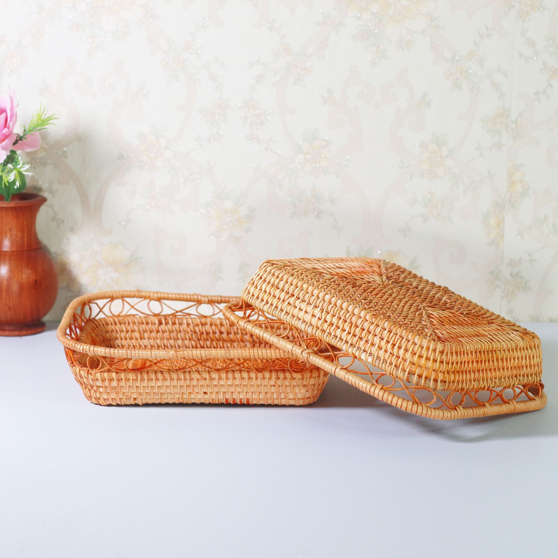 手作りベトナム藤編みバスケット鉄芸果物バスケット竹バスケット茶器収納バスケット新中国式復古トレイ