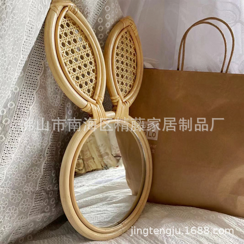 精藤居藤編ウサギ耳月鏡子供部屋飾り化粧鏡インスタ風壁掛け籐編み飾り