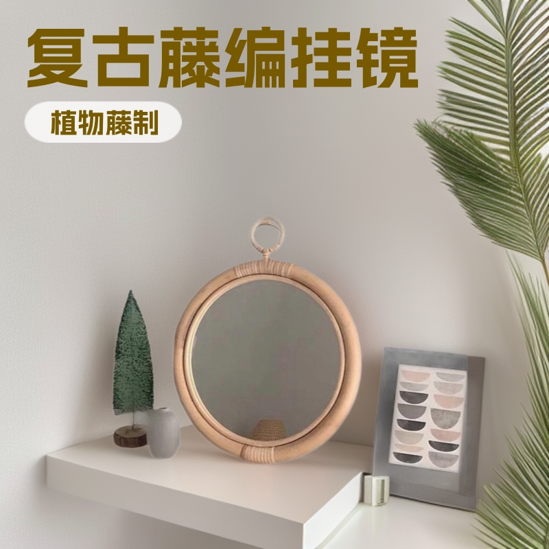 北欧フランスレトロ文芸ins藤編み鏡手作り円形掛け鏡玄関寝室家庭用民宿化粧鏡