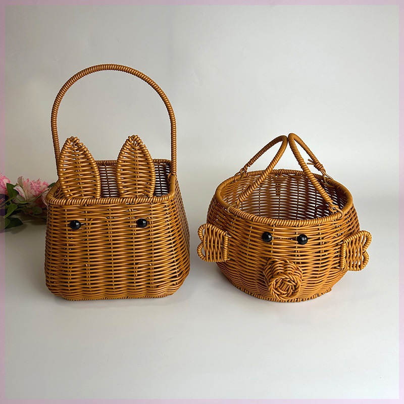 クリエイティブな子供用ポータブルバスケット、手作りの模造籐織り屋外親子バスケット、ウサギと豚の収納バスケット、フラワーバスケット、フラワーアレンジメント