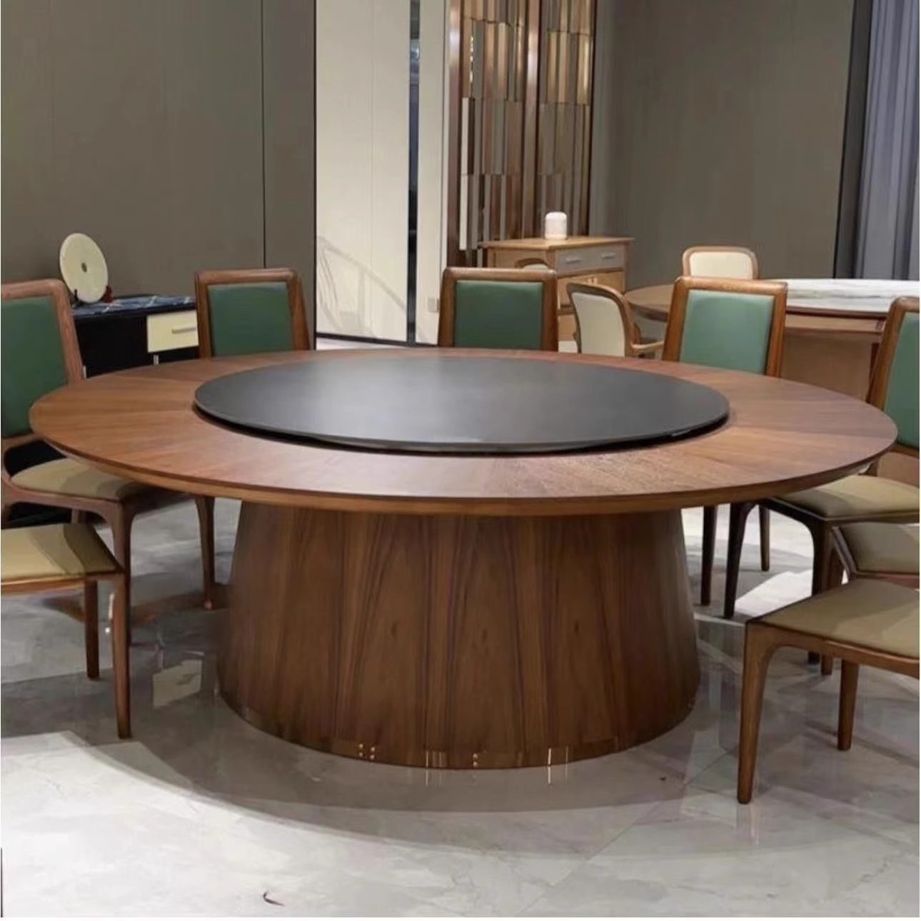 在庫あり、短納期、ホテル大型ラウンドテーブル、ターンテーブル付き電動無垢材ダイニングテーブル、ロックプレート、15人、20人、ホテルクラブ