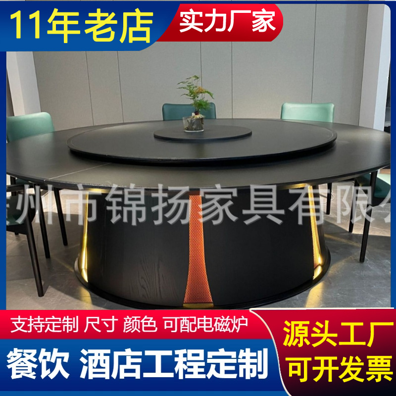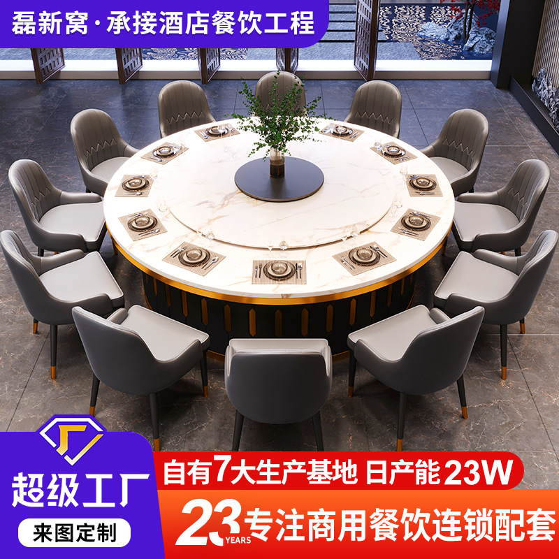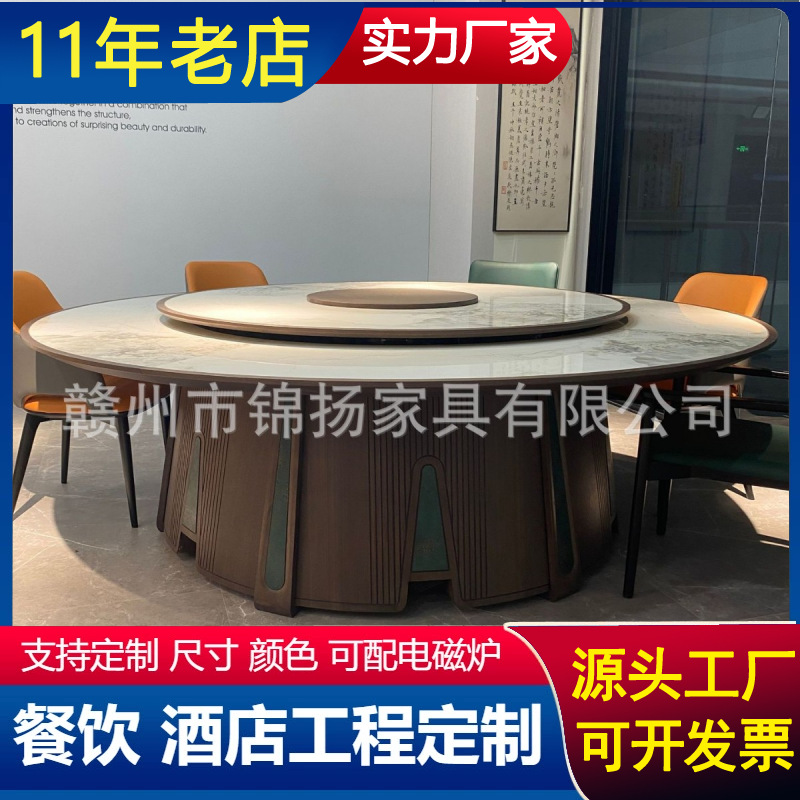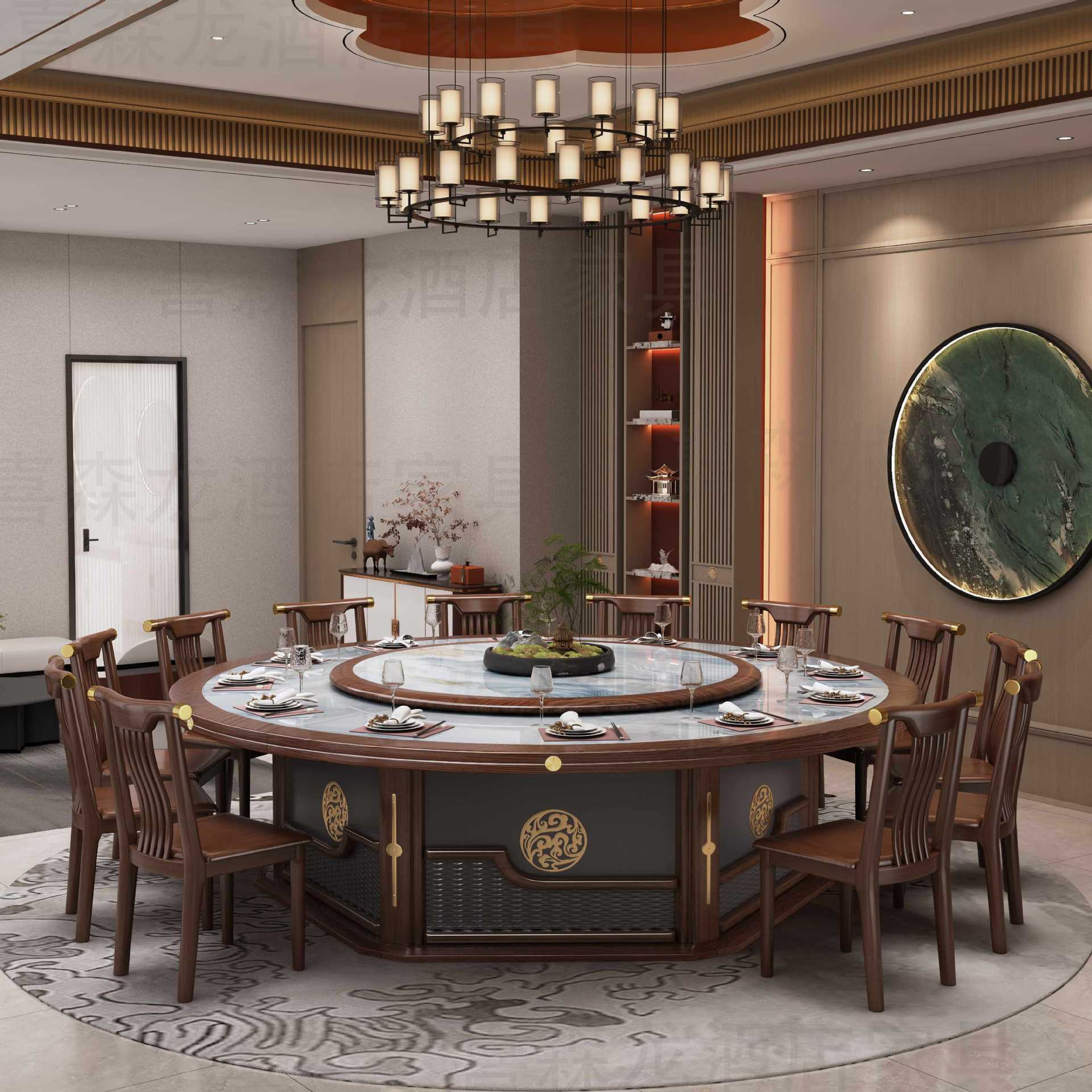 ホテル電動ダイニングテーブル、大型丸テーブル、新しい中国風の岩板無垢材鍋テーブル、ホテルクラブ家庭用20人用丸テーブル