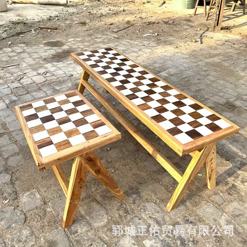 わびさびスタイルのレストラン古いニレのベンチホームステイホテル無垢材寄木細工の市松模様の低いスツール寝室のベッドサイドのスツール