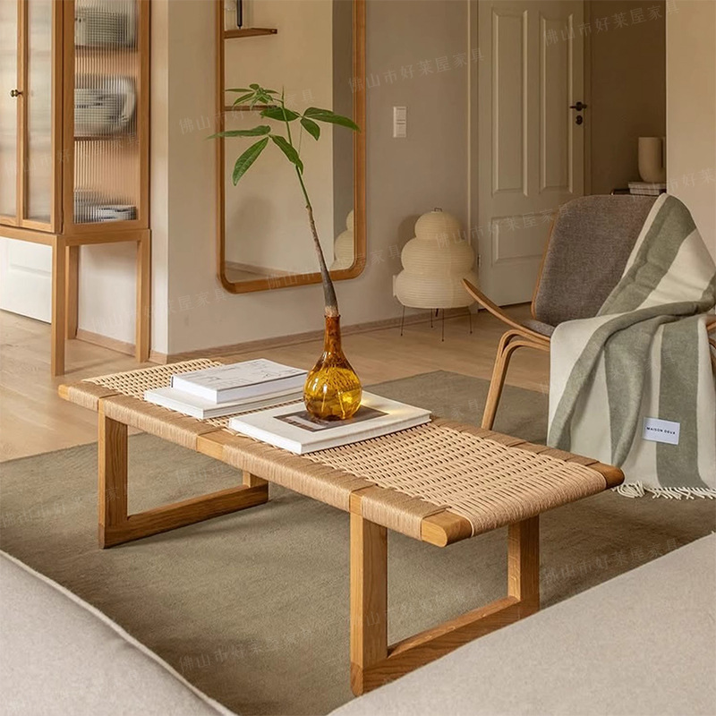 無垢材のロングベンチ、B&B、わびさびスタイルのログシューズチェンジベンチ、寝室の籐のベンチ、レトロなモーセンロープのベッドサイドベンチ