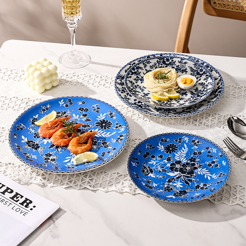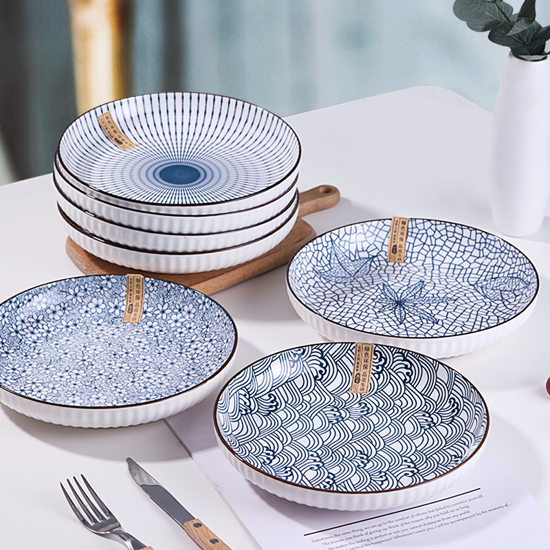 7インチ8インチ日本式釉薬下彩陶磁器皿レトロ皿料理皿餃子皿サラダ皿家庭用深皿