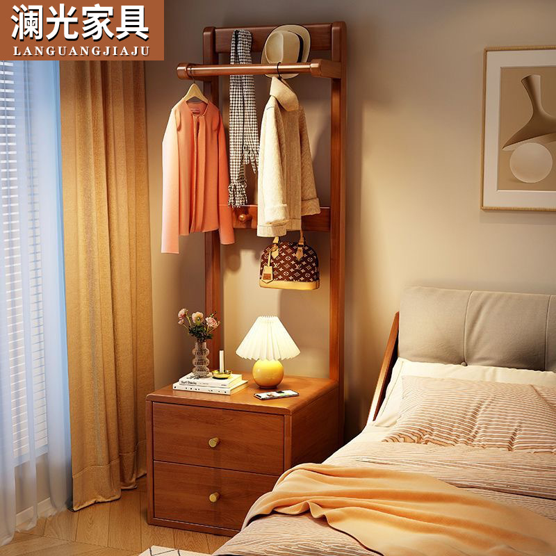 黒胡桃木実木ベッドサイドテーブルハンガー一体小型寝室ベッドサイドベッドサイド服収納棚移動可能