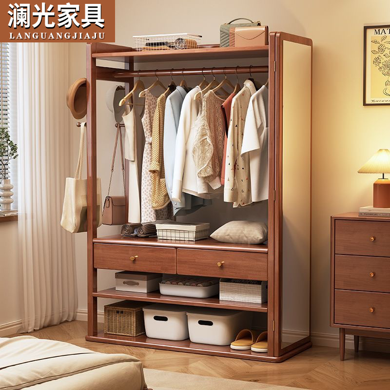 シンプルな木製フードラック家庭用寝室服装鏡一体ハンガー床置き棚引き出し付き収納棚