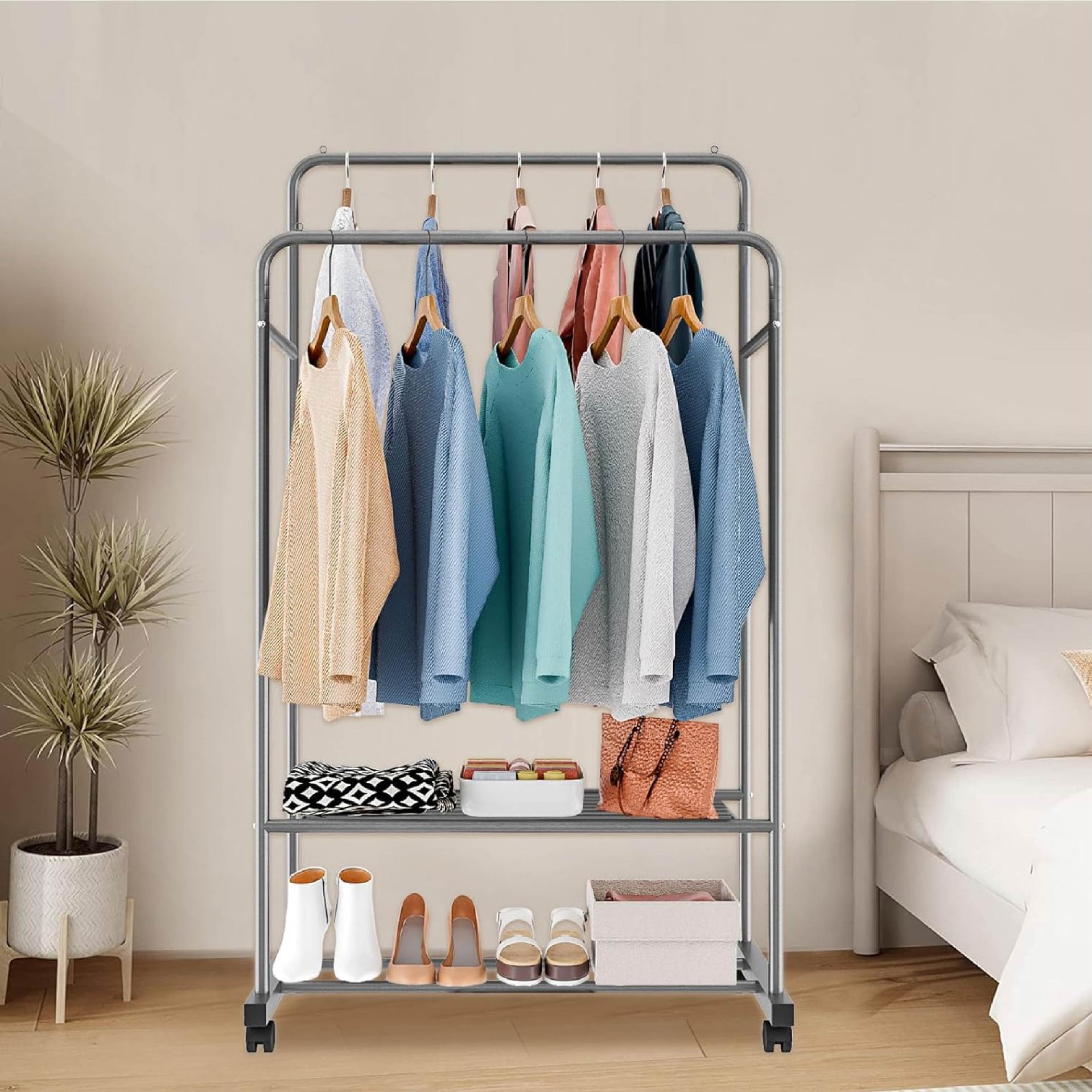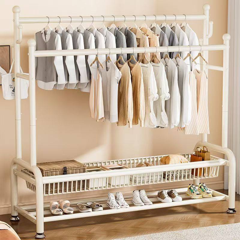 極厚衣類ラック床置き家庭用寝室床置き衣類ラック寮ダブルロッド床置き衣類ラックフレーム付きモバイル衣類ラック