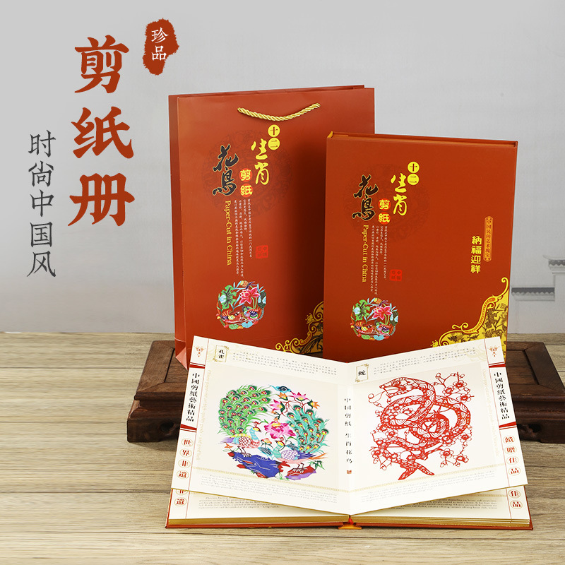 中国風の特色のある蔚県の切り紙の作品は贈り物の冊の12生肖の花鳥を描いて英語で海外に行って外国に送ります。