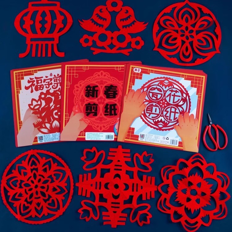 春節手作り切り紙子供折り紙切り窓花紙切り紙中国風図案原稿新年幼稚園手作り