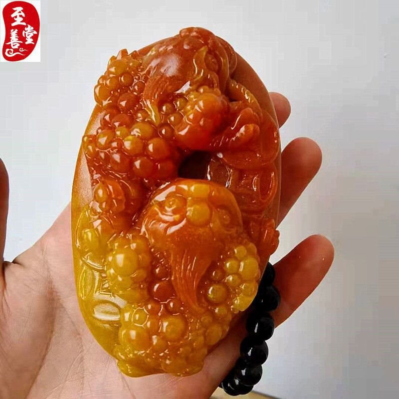 玉寿山石彫刻の取っ手の奇石の観賞石の金のヒキガエルは取っ手の縄の立体彫刻の取っ手を送ります。