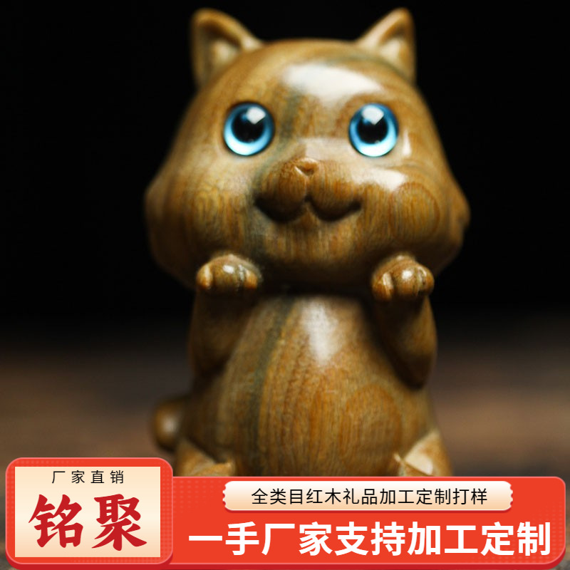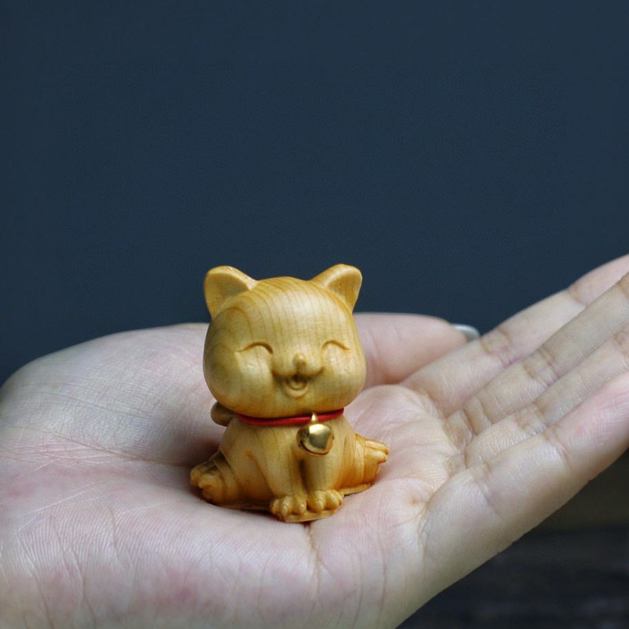 クスノキの木彫りかわいい動物干支鐘猫装飾品デスクトップ装飾工芸品ペンダントハンドル