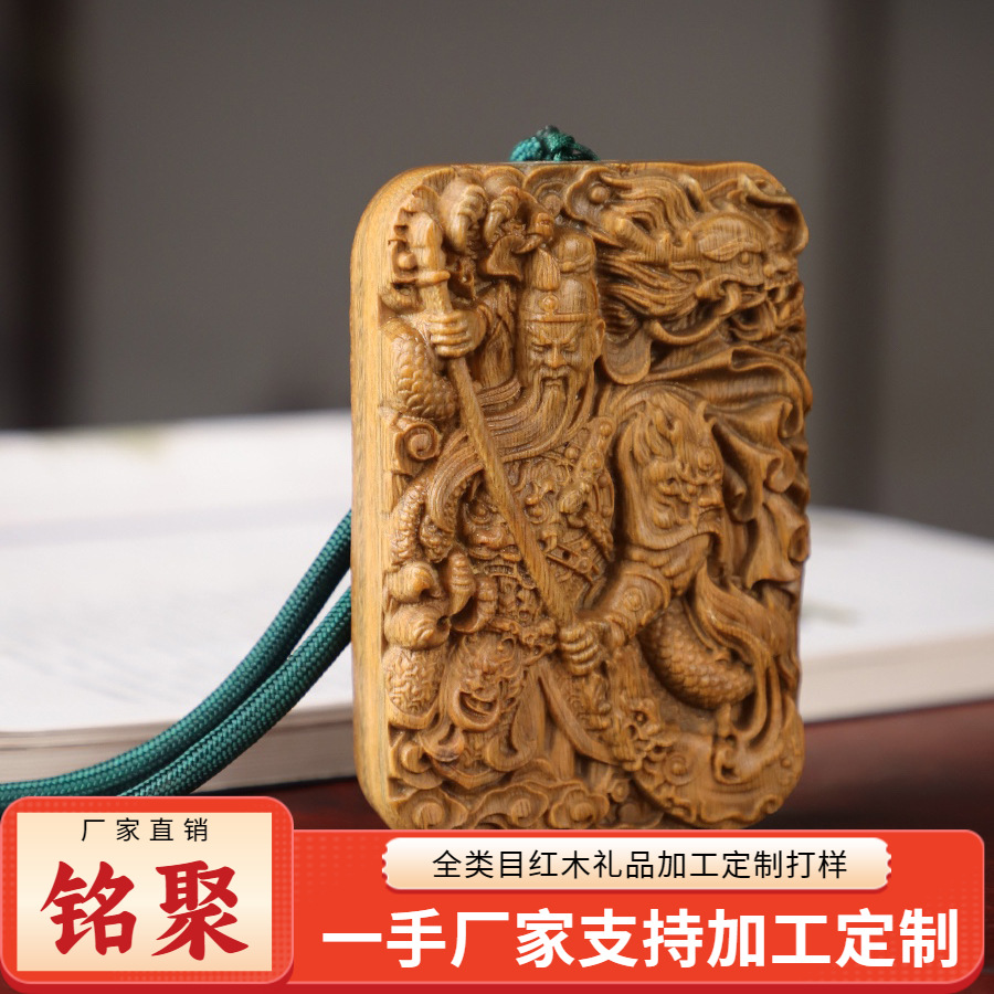 Mingju 古代スタイルの緑白檀彫刻関公無事プレート車のペンダント義薄雲天文おもちゃハンドピース車